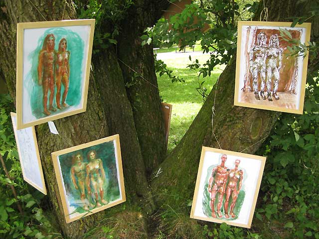 Eine Serie von 10 nackten Menschenpaaren, gezeigt bei Wind und Regen unterm Baum in der Ausstellung SEH AM SEE des Kunstvereins Karlsfeld bei Muenchen 2005. - Series of 10 nude couples in wind and rain under a tree on Karlsfeld lake show near Munich.